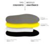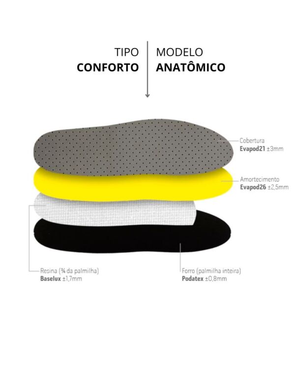 Ela é confeccionada em EVA de alta qualidade, com duas camadas de densidades diferentes, proporcionando equilíbrio entre conforto e sustentação. Conta ainda com uma camada de resina, responsável por dar estabilidade estrutural à palmilha e permitir a moldagem anatômica, além de forro em tecido, que fica em contato direto com o calçado, auxiliando no conforto e na absorção do suor.